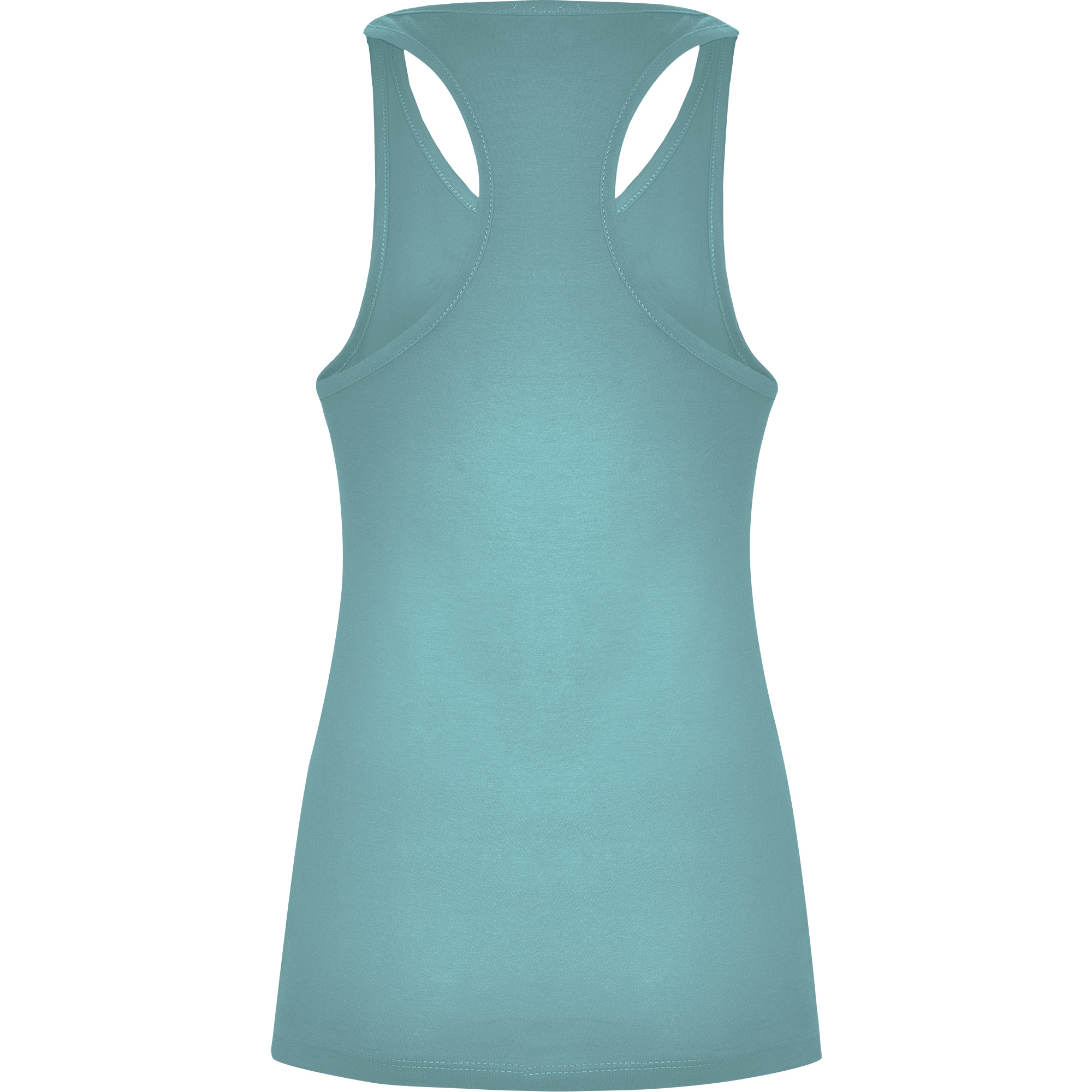 Camiseta entallada, con sisas y escote ribeteado, ancho y enrollado. Espalda estilo nadadora y costuras laterales.