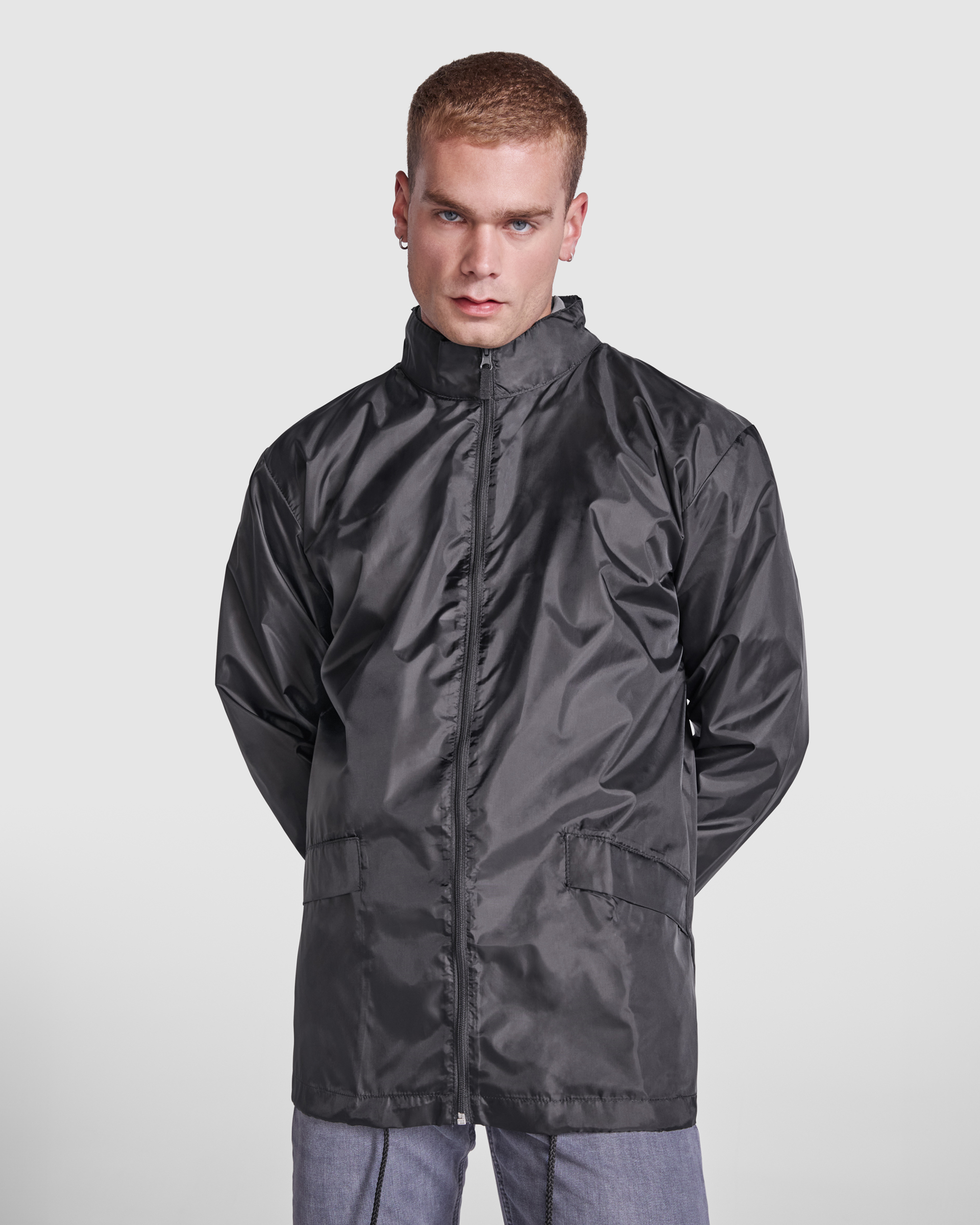 Chubasquero unisex. Cuello alto y capucha extraíble con cordones ajustables. Cremallera central al tono con tirador. Dos bolsillos laterales con solapa. Puños elásticos. Bajo con cordones ajustables en interior. Goma elástica en el interior del bolsillo para su plegado y guardado.