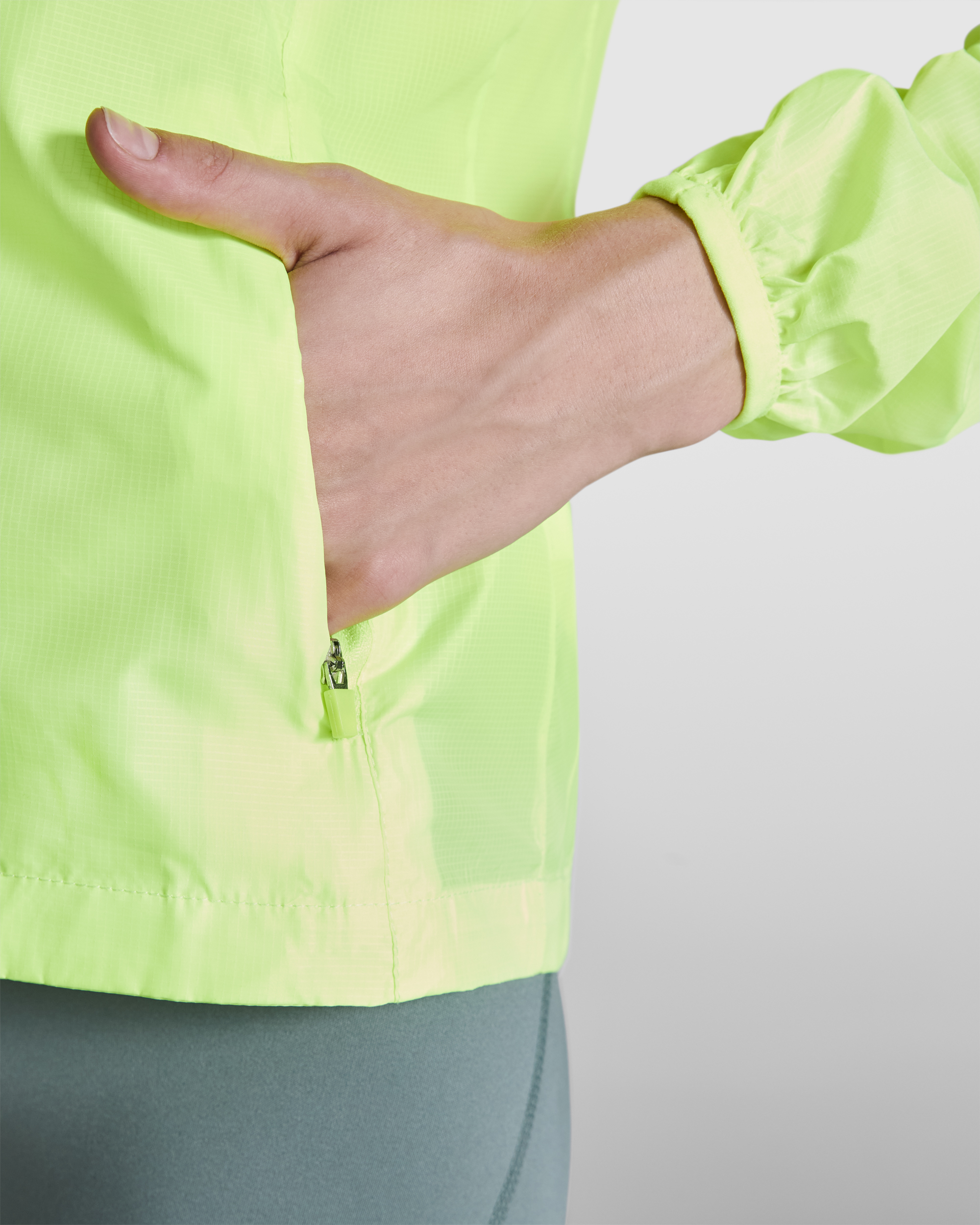 Chaqueta cortavientos en tejido técnico ligero. Interior de cuello forrado en tejido transpirable con cubrecosturas. Cremallera invertida con detalle reflectante, protector de barbilla y tirador. Corte de mangas ranglán. Tejido transpirable en la parte de las sisas. Bolsillos delanteros con cremalleras. Corte entallado. Bolsillo interior para guardar la prenda. Puños con ribete elástico. Detalles reflectantes en espalda. Bajo con espalda ligeramente más larga.