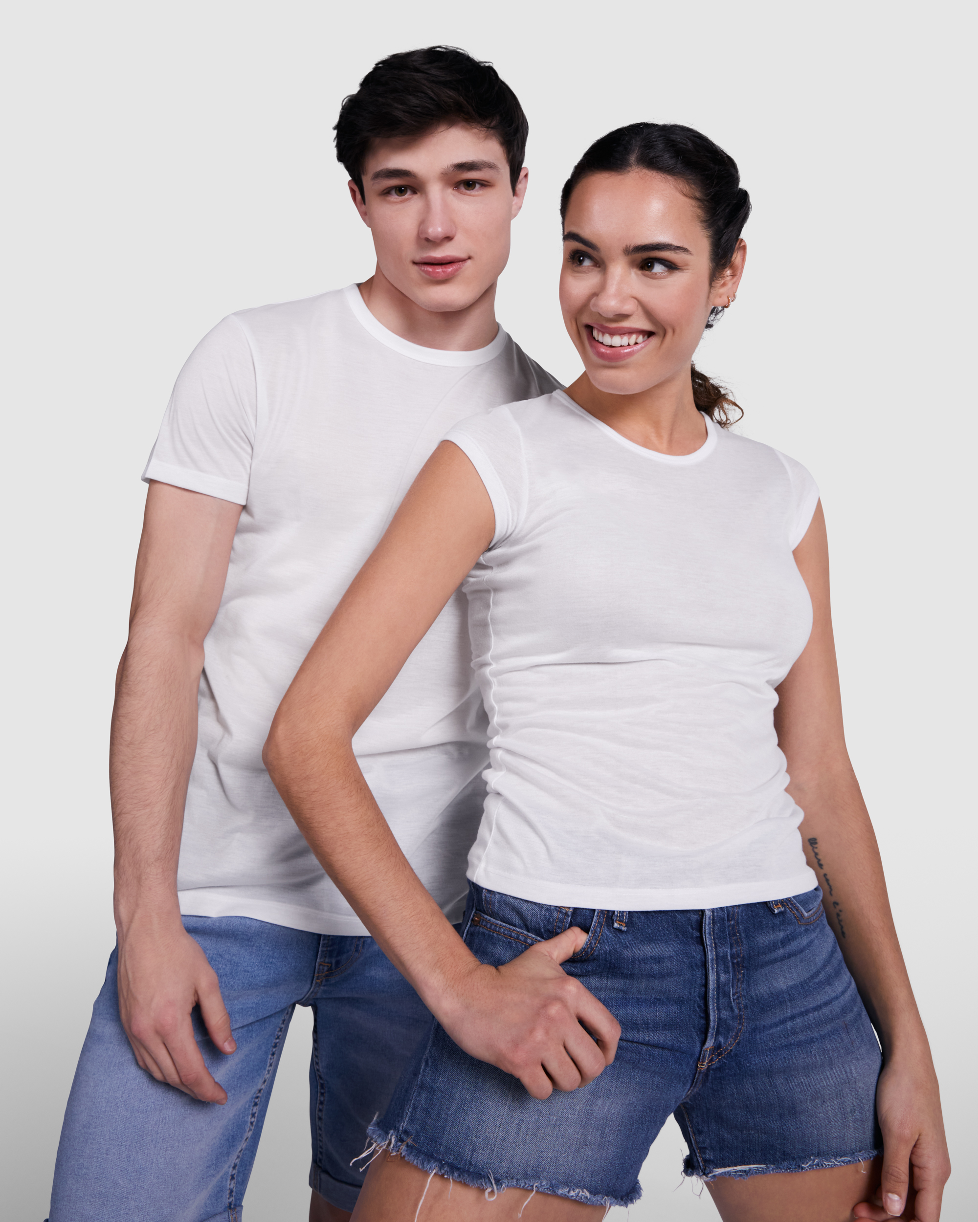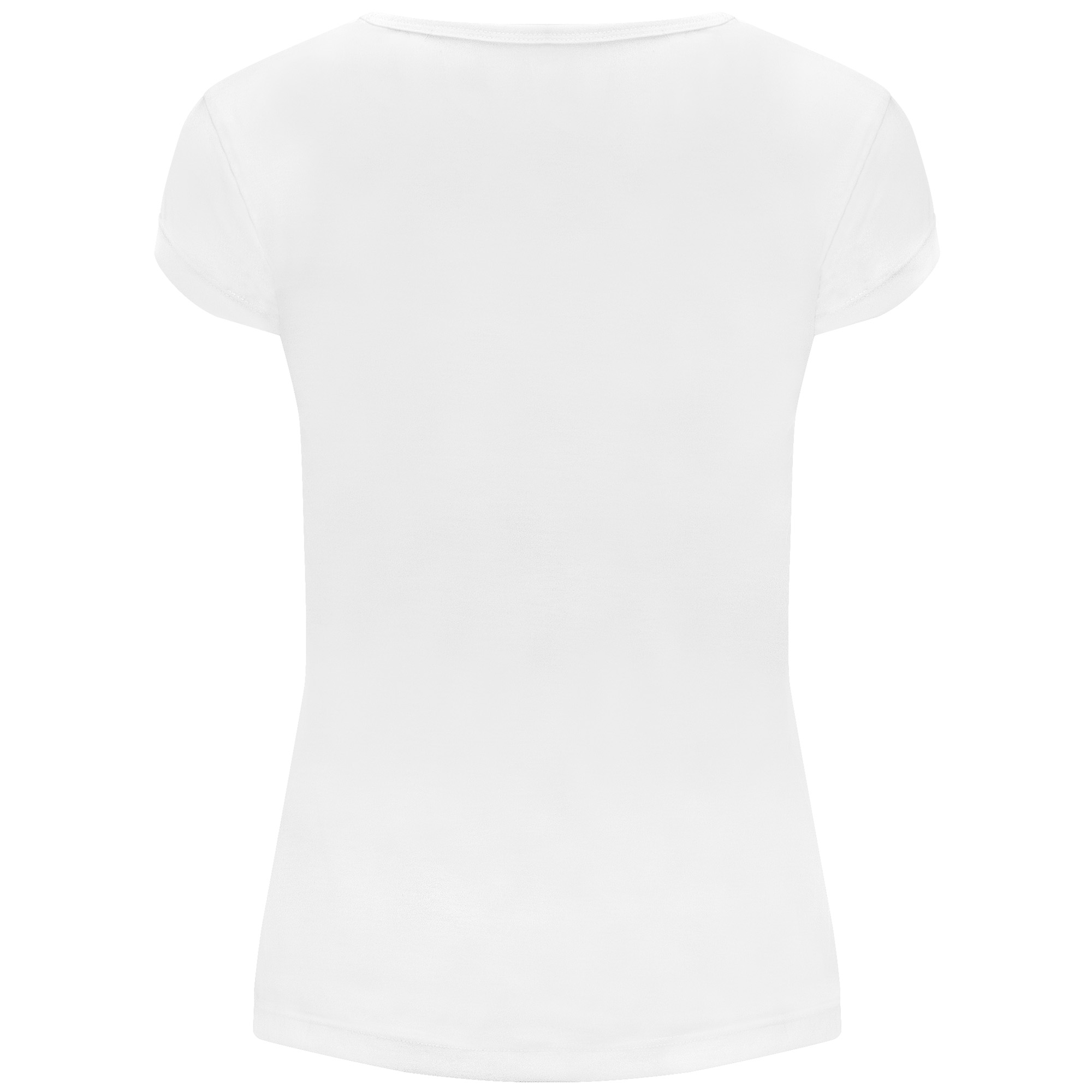 Camiseta de mujer de manga corta de diseño entallado con cuello redondo ribeteado en el mismo tejido y costuras laterales. Tejido de poliéster con tacto algodón.