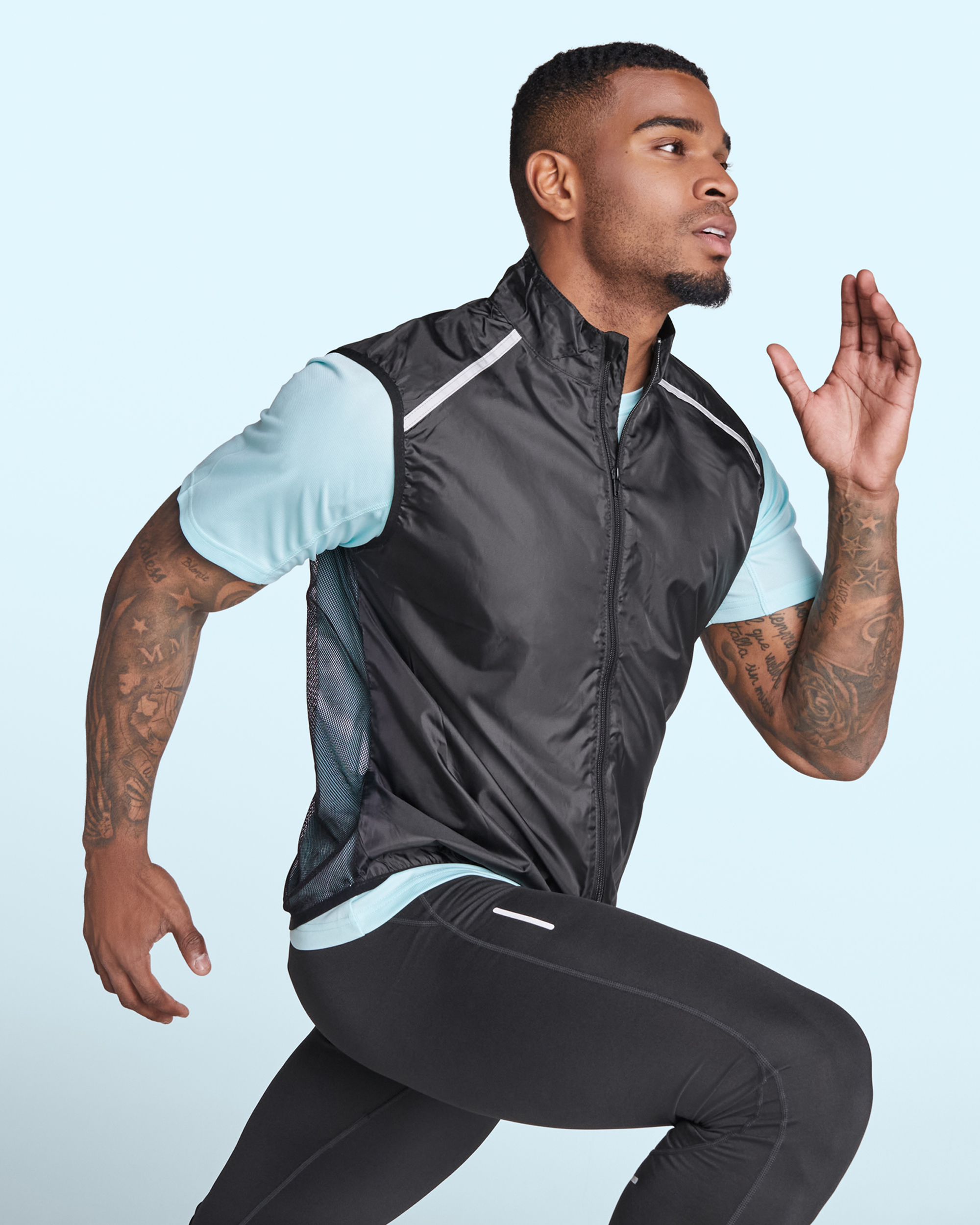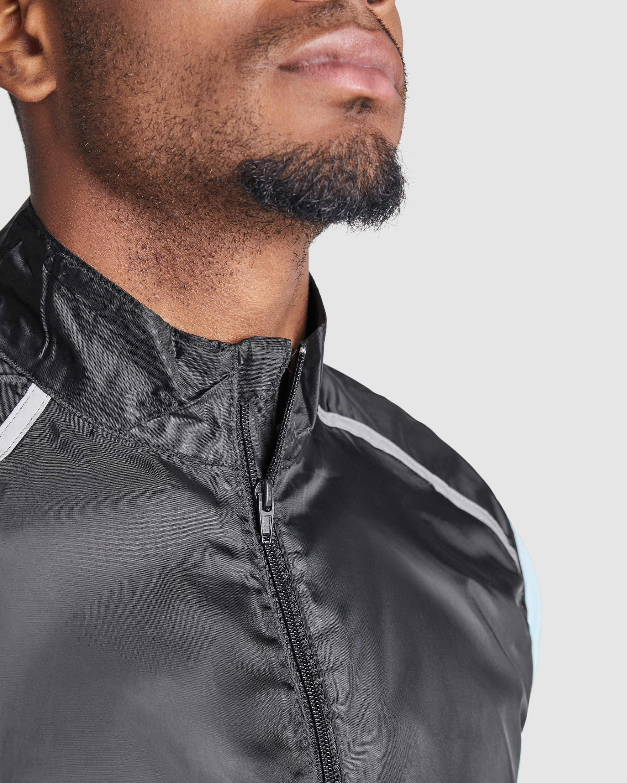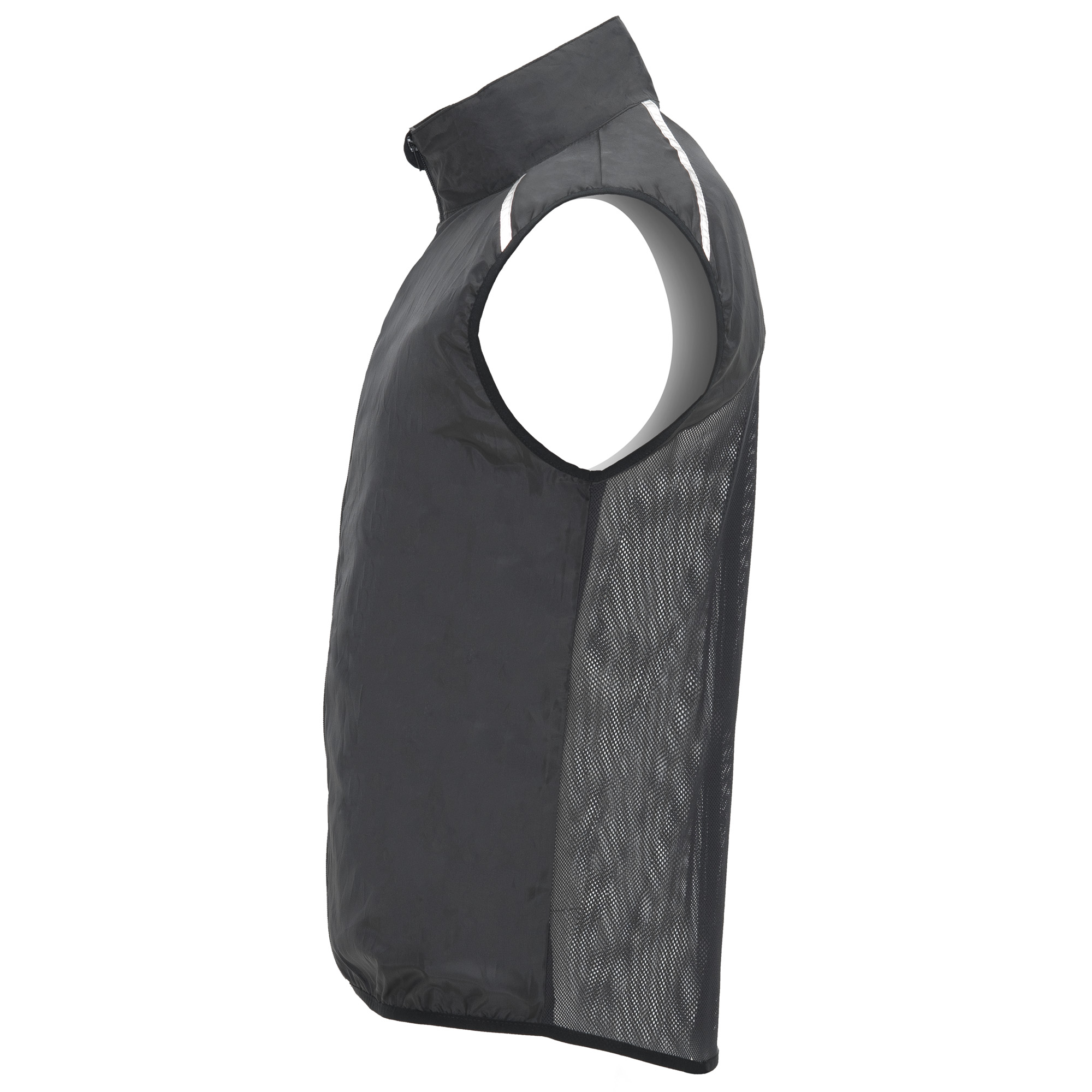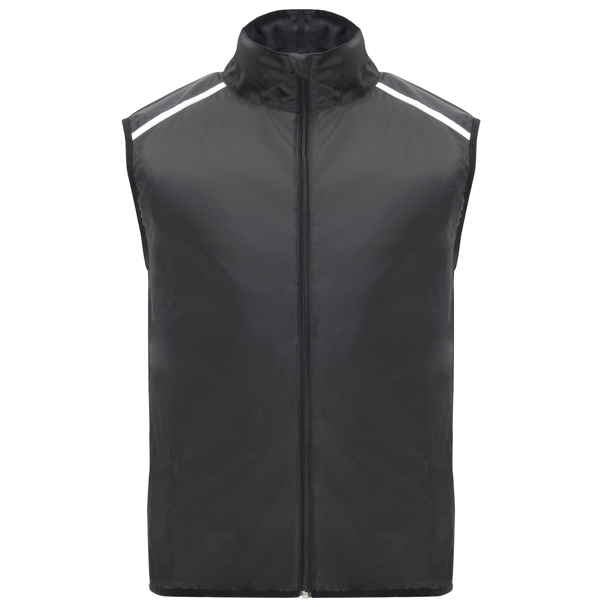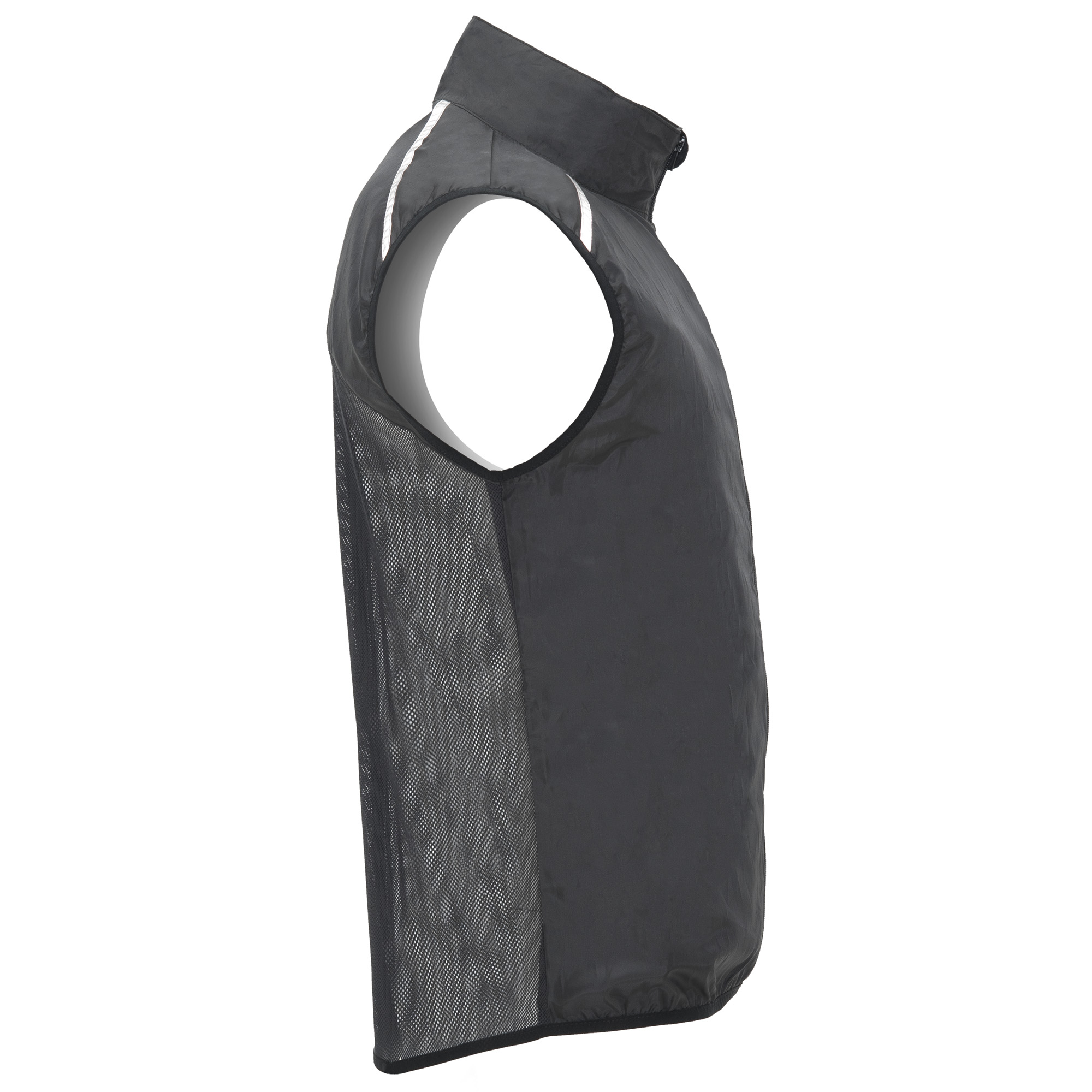 Chaleco técnico ligero de running, con cremallera frontal a tono con protector de barbilla. Ribete elástico en sisa y bajo. Parte inferior de la espalda en tejido micro perforado. Detalles reflectantes en la parte superior, delantera y trasera. Bolsillo con elástico para guardar el chaleco y llevarlo en la muñeca.