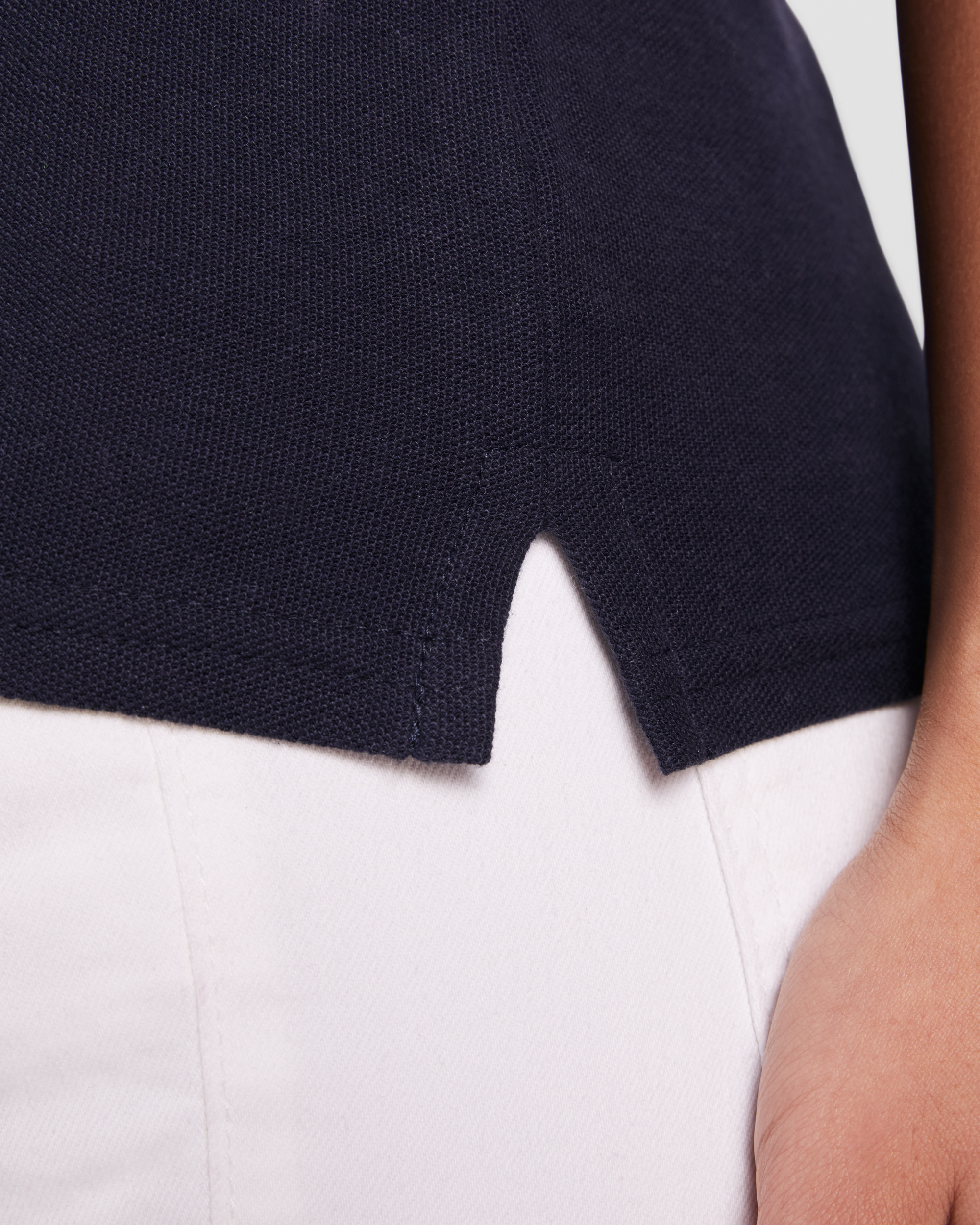Polo de mujer entallado de manga corta en algodón orgánico certificado OCS. Cuello y ribete de mangas en canalé 1×1. Tapeta con 2 botones. Cubrecosturas reforzado en cuello. Aperturas laterales en el bajo.