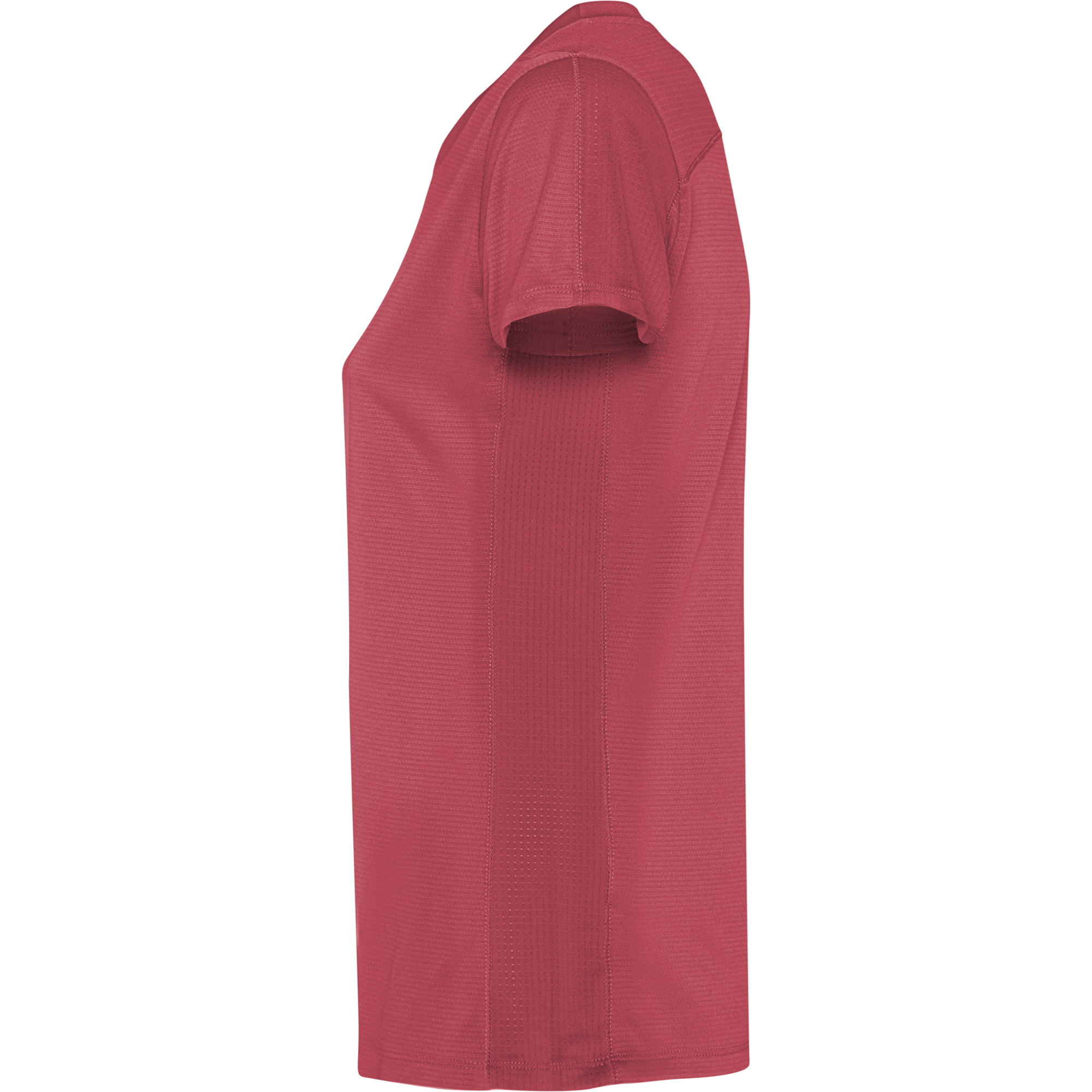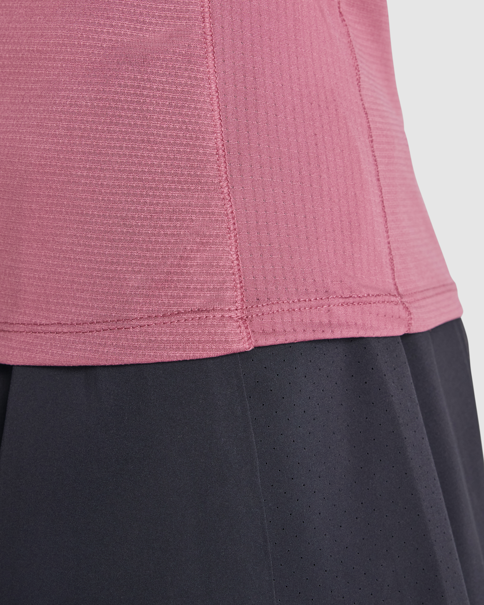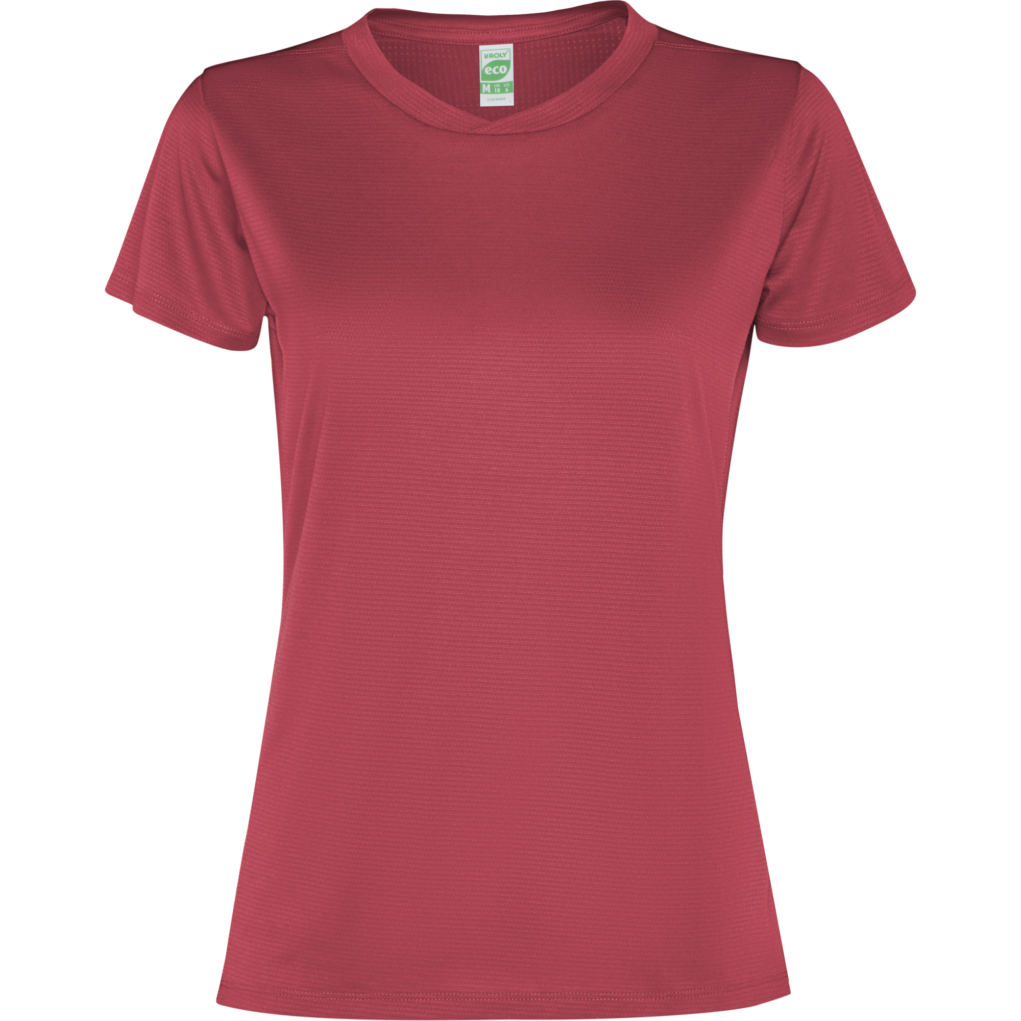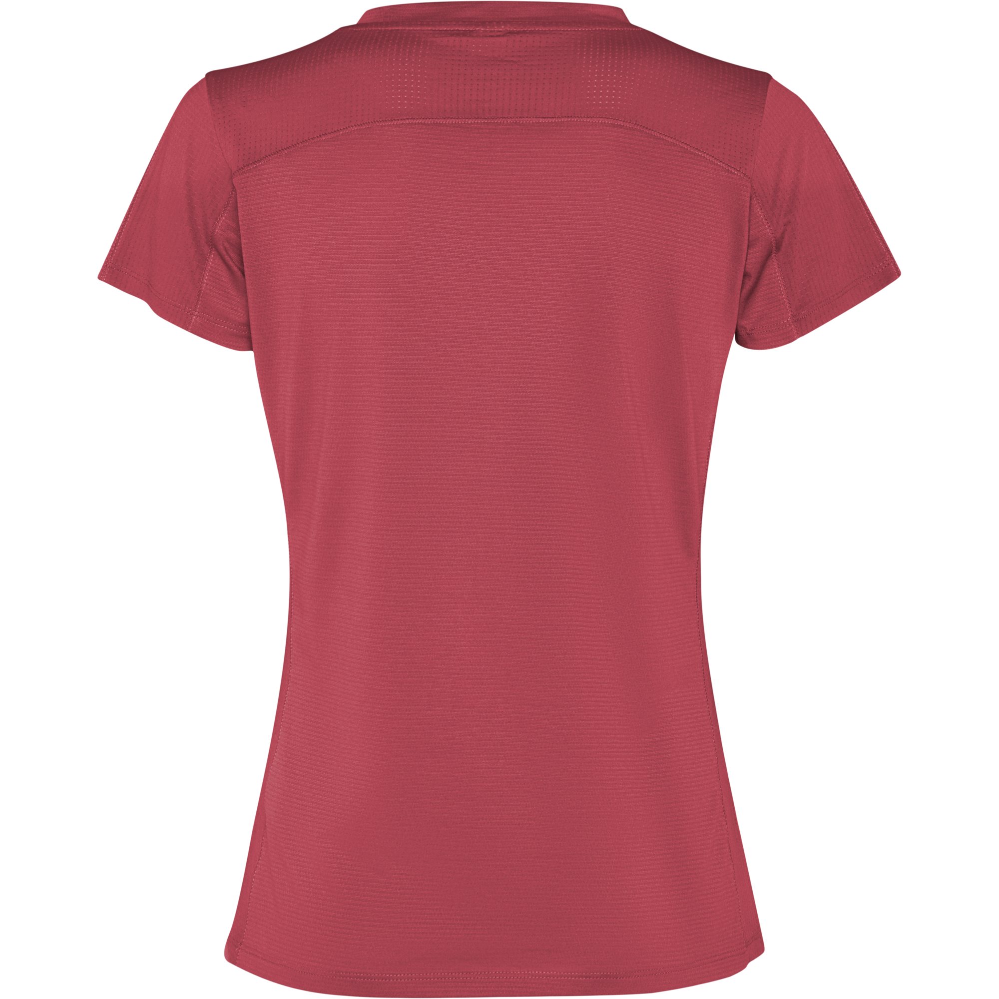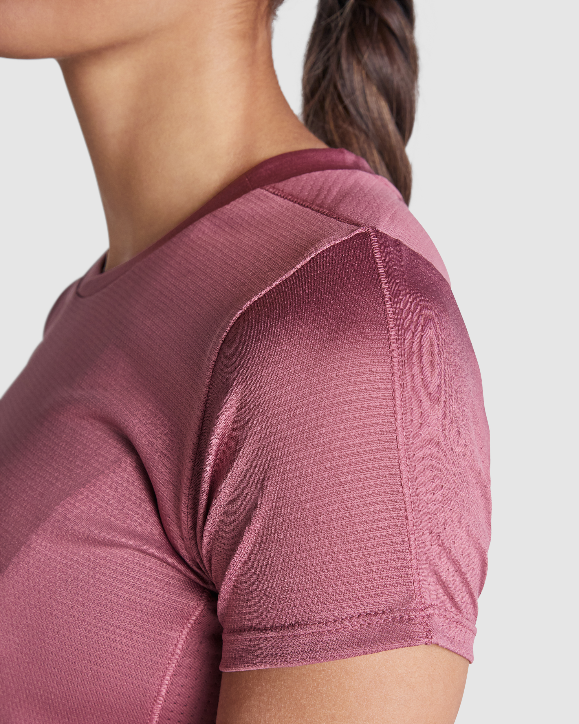 Camiseta técnica de manga corta para mujer. Tejido ligero realizado en poliéster reciclado. Cuello con detalle cruzado y cubrecosturas. Canesú en espalda y piezas en mangas en tejido transpirable. Costuras adelantadas e inclinadas en laterales y hombros. Bajo redondeado. Combinada en tejidos transpirables y elásticos.