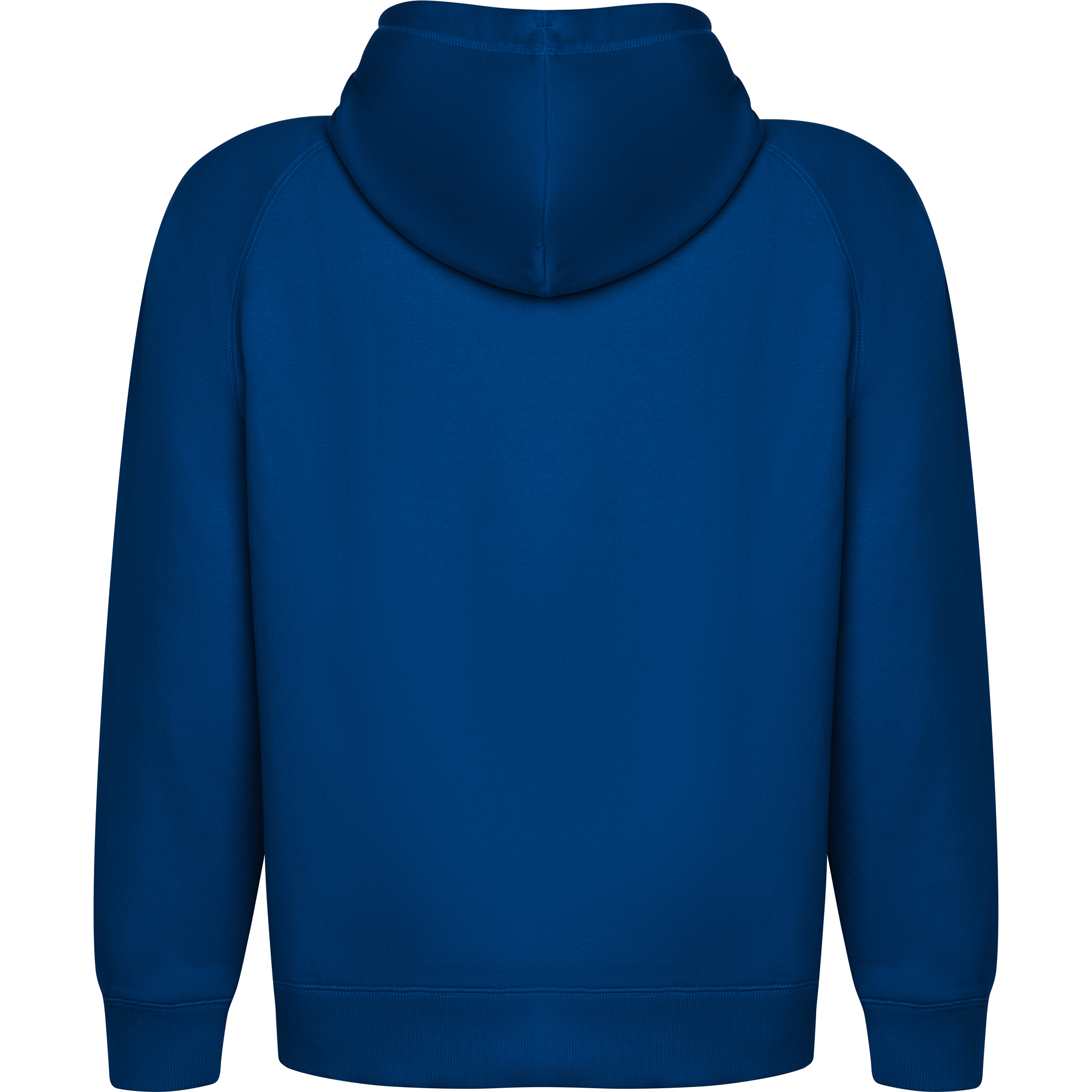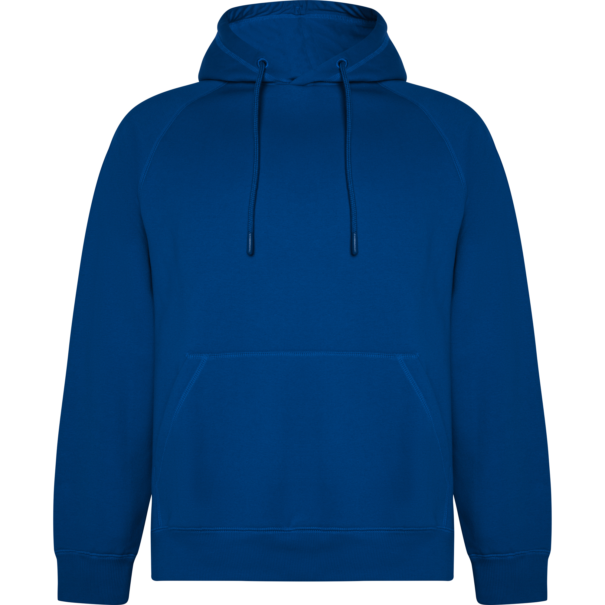 Sudadera con capucha Unisex en Algodón Orgánico Peinado y Poliéster Reciclado. Bolsillo Canguro. Capucha forrada de punto liso y cordones redondos ajustables, ojales bordados. Cuello puños y cinturilla de punto canalé 2×1.